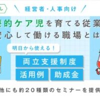 | 東京都働き方改革パワーアップ事業 「医療的ケア児を育てる従業員が安心して働ける職場とは? 」 東京都内に事業所を有する 従業員数2~999名の企業担当者様が受講いただけます。 |